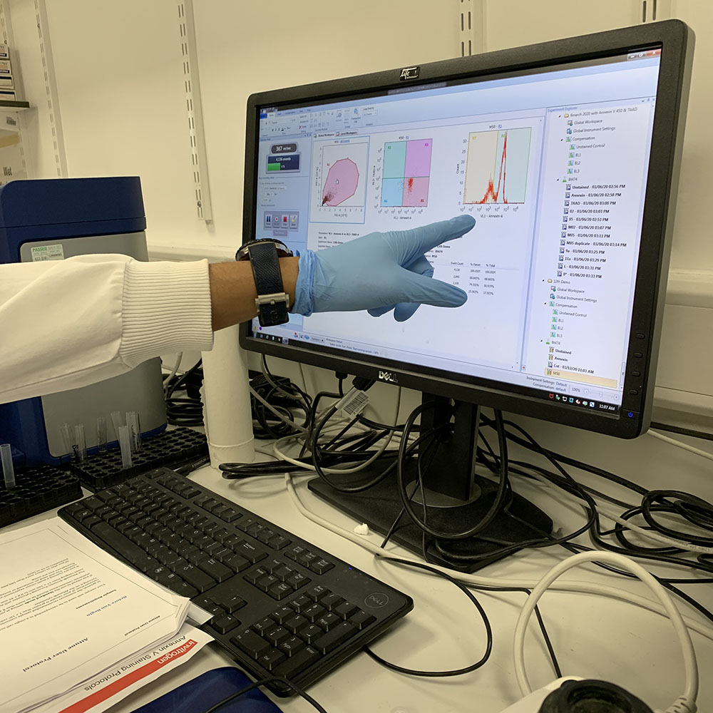 The read out from the cytometer is shown in a graphic display on the cytometer’s monitor. Here we are looking at the percentage of cells that have died as a result of being treated with the MP1 peptide. The four box model on the screen shows living cells, early apoptosis, late apoptosis and necrosis after treatment with a particular peptide concentration.