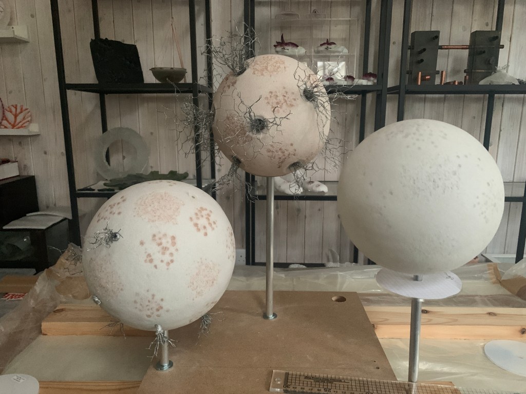 Once the vesicles were underway, one of the major considerations in creating the piece was the relationship between all the different elements. I had already, obviously, committed to creating the ‘vesicles’ and ‘z-stack’ at certain sizes and imagined them situated in relation to each other, but there was still quite a lot to be considered in getting the relationships right. There was also a lot of planning and experimentation in creating the fixings to hold the glass in position.