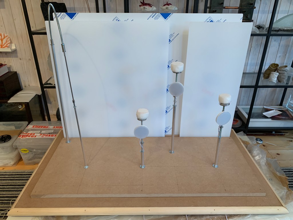 Once I had a sense of the sizing and spacing, I set to constructing the base and the stands that would hold the glass elements. I was also trying to take into account that the piece would need to travel from my studio to the hospital in Leeds, so my aim was to make the piece so that it could be deconstructed again for transport.