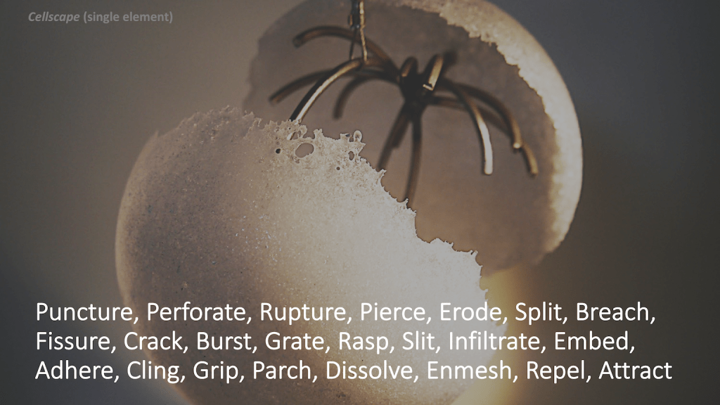 When I was initially thinking about my approach to the Peptides project, before my first visit to Leeds to present my pitch for the project, I was thinking very much about metaphors for the process by which the peptide acts on cell walls. Here are a couple of slides from my pitch, outlining my thoughts: