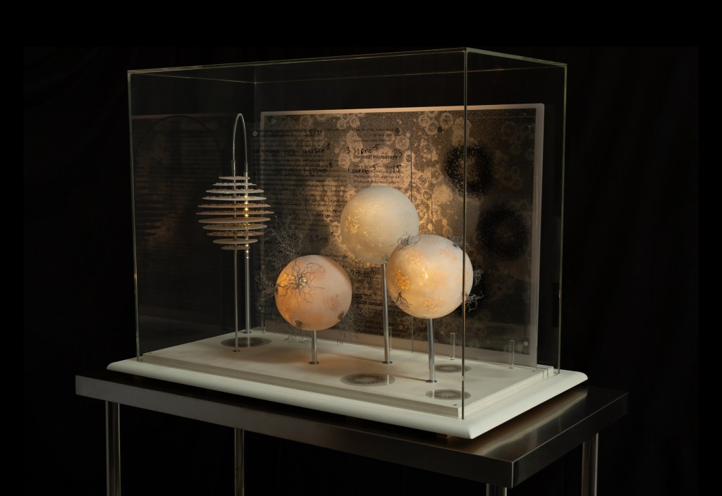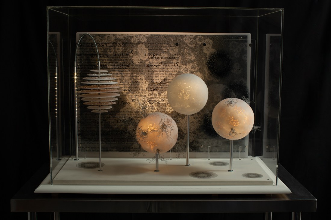 The vesicles were not intended to be a scientific representation, but more something between an evocation and an abstract sculpture. Having said that, there were a number of concepts that I had found really interesting from the time I spent in the lab that I wanted to inform the development of the vesicle elements, so I set about playing with ideas and techniques that would take on those ideas.
